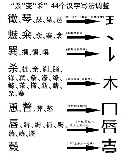 一些網(wǎng)友認為,調(diào)整漢字如果只注重美感,就把傳統(tǒng)的東西丟掉了。比如“殺”字,本身下面像鉤像矛,有“殺氣”,下面改成“木”后,感覺就變了。專家解釋,這次調(diào)整字形有些地方參考了臺灣的字形。