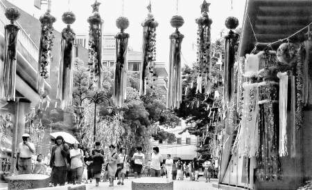 鳥住貞義先生還給我放了一段去年七夕時,枚方市祭掃“七夕神社”的錄像,我看到,前往祭掃的人除了“七夕研究會”的成員外,還有當(dāng)?shù)氐淖h長、市府官員以及許多民眾。在“七夕神社”的周圍栽了很多竹子,前往祭掃的大人小孩都將自己的心愿寫在一張長紙條上,然后掛在竹子的枝條上,用來祈福。這使我想起日本小鈞市的“七夕文化”,也牽涉到兒童,“七夕”這天早上,凡年滿6歲的兒童在媽媽的陪同下,到野外的莊稼上取些露水回家,然后用露水磨墨寫字。這是一種儀式,代表兒童從這一天起,就開始啟蒙讀書寫字了。據(jù)我考證,這是日本和中國“七夕文化”略有不同的地方,其他如七夕夜放河燈,為牛郎與織女照明祝福;一家人在庭院里擺上桌子,沏上香茶,一邊品茶一邊觀看牛郎與織女相會天河的美景;在葡萄架下側(cè)耳傾聽牛郎與織女相會時的絮語;姑娘在絲瓜架下默默地向天上‘乞巧’,盼望自己能像織女那般心靈手巧,這些幾乎是相同的。□文/圖 湯禮春