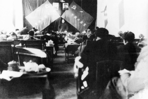 會(huì)場(chǎng)并不大,只有一百多平方米,是中央工委時(shí)期修建的大伙房。會(huì)場(chǎng)布置得非常簡樸,正面墻上懸掛著毛澤東和朱德的照片,兩邊墻上是鮮艷的中國共產(chǎn)黨黨旗。主席臺(tái)是一張舊長桌,上面一條花毛毯上鋪放了一張虎皮,為會(huì)場(chǎng)增添了一些威嚴(yán)。
