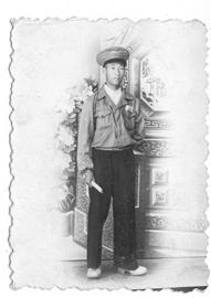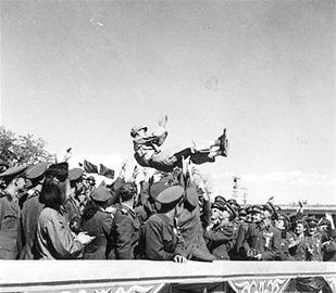 閱兵結(jié)束后,張百川跟同學(xué)們紛紛跑到照相館拍照留念。大家都穿著閱兵時的裝束:為閱兵專門配發(fā)的綠色飛行員帽子、上衣,白色襯衣,腳上穿著咖啡色的仿毛皮鞋。張百川介紹說,原本發(fā)的是普通的軍用膠鞋,為了踢正步時鏗鏘有力,特意發(fā)放了這樣的皮鞋,據(jù)說是抗日時繳獲日軍的。