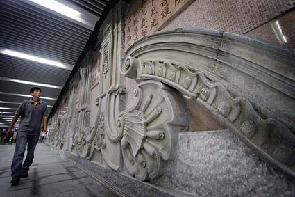 西單地區(qū)在上下行電梯頂部懸掛了《老字號(hào)》、《老北京》的浮雕作品,映襯了其“核心商業(yè)區(qū)”的地位。