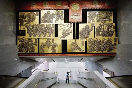 據(jù)記者了解,這些藝術(shù)品由市軌道建設(shè)公司和中國壁畫學(xué)會(huì)聯(lián)手,請(qǐng)來知名藝術(shù)家全面設(shè)計(jì)和創(chuàng)作。這些藝術(shù)品多裝飾于站廳層或通道的墻壁上。