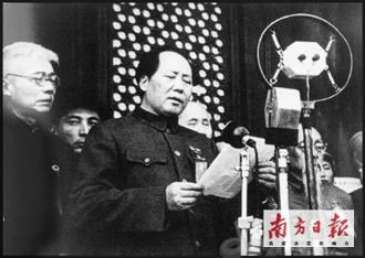 毛澤東主席神情肅穆。他邁著穩(wěn)健的步子走到麥克風(fēng)前,環(huán)視了一下廣場(chǎng)上沸騰的人群,平緩了一下呼吸,用他那濃重而激昂的湘音,莊嚴(yán)宣布: