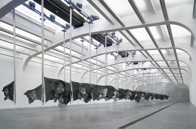 每天晚7點是尤倫斯當(dāng)代藝術(shù)館閉館的時間。大展廳里震耳欲聾地響了一整天的鼓風(fēng)機停了。34 幅被吹得呼啦啦飄揚的旗幟以及旗幟上34 張嬰兒的臉也隨著風(fēng)力消失,癱軟下來,耷拉在旗桿上。仿佛大退潮,展廳盡頭的灰色風(fēng)景墻露了出來,那面墻上畫著沒有人煙的山頭。遠(yuǎn)望去,旗桿如墳?zāi)股系钠鞄茫椴迳降亍?/p>