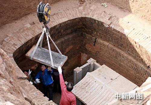 據(jù)了解,八月下旬,西安國(guó)家民用航天產(chǎn)業(yè)基地在長(zhǎng)安杜陵塬上修建道路時(shí)發(fā)現(xiàn)一座古墓,西安市文物保護(hù)考古所經(jīng)過(guò)清理發(fā)掘,使這座唐代廡殿式石槨墓葬完整地展現(xiàn)在世人面前。九月二十七月,考古人員將這座墓葬內(nèi)的文物實(shí)施整體搬遷。首先對(duì)墓葬內(nèi)的石槨進(jìn)行拆解編號(hào),隨后用吊車將每塊文物起吊到地面上用毛氈包裹,用龍骨、鐵絲加固后裝上一輛封閉式的卡車內(nèi)。