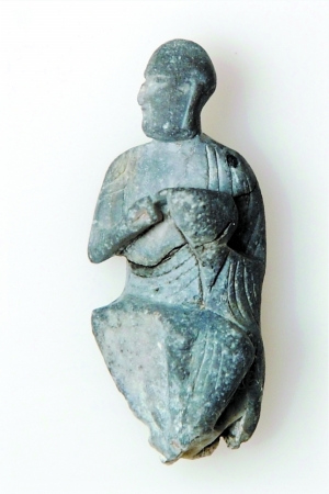一尊長度只有七八厘米、近乎墨綠色的石制羅漢造像(見左圖),人物表情和衣飾還依稀可辨,有趣的是頭像鼻子特別挺直,頭型臉型都像老外。