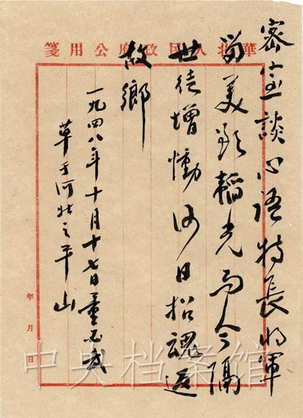 1949年 9月 1日,馮玉祥遇難周年祭日追悼會(huì)在北京舉行,出席者有李濟(jì)深、宋慶齡、周恩來、沈鈞儒、張瀾、何香凝、郭沫若、林伯渠、吳玉章、董必武及馮玉祥夫人李德全等 600余人。毛澤東、朱德及各民主黨派、各人民團(tuán)體送了挽聯(lián)花圈。毛澤東親筆題詞: “馮玉祥將軍逝世周年紀(jì)念謹(jǐn)致悼意。 ”周恩來在致詞中說:馮玉祥先生從一個(gè)典型的舊軍人轉(zhuǎn)變成為一個(gè)民主的軍人,他經(jīng)過了曲折的道路,最后走向新民主主義的中國。馮先生堅(jiān)決地拒絕了美帝國主義對(duì)他的誘惑,毅然離美準(zhǔn)備回到中國解放區(qū),接受參加新政治協(xié)商會(huì)議的號(hào)召,不幸遇難,實(shí)值得大家紀(jì)念。