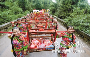 “人逢喜事精神爽,不知不覺(jué)就走攏了;恭喜主人,花轎來(lái)到你家門;你姑娘打扮好沒(méi)有?迎親隊(duì)伍都到了喲……”媒婆打招呼,成了新娘出閣特定的開場(chǎng)白。與女方對(duì)答完后,媒婆一聲“把禮盒抬進(jìn)去”,男方迎親隊(duì)伍中的總管即出列呈上禮單。之后,新娘“忙”起了上花轎前的出閣儀式:踩斗、丟筷子、罵媒、父親壓轎、哥哥背上轎、哭嫁。