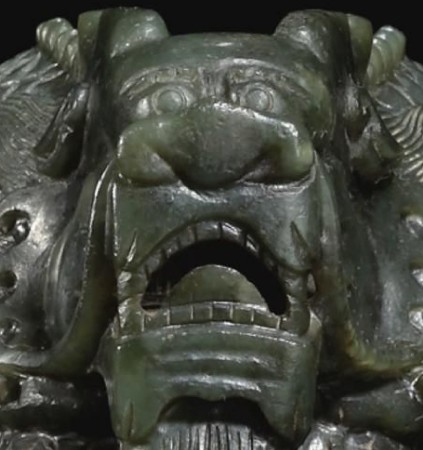 李教授同時(shí)指出此次拍賣的“八徵耄念之寶”印龍爪、頭部紋飾雕工疲弱而少章法、刀法。龍的發(fā)紋不上沖,火焰紋并不上揚(yáng),龍爪粗野乏力、沒有抓力,缺乏動(dòng)感,似走獸類臥伏在地面一般,龍脊拱沿處造型用,用刀不干凈表現(xiàn)無弧勢(shì),顯出臃腫、毫無生氣,因造型力度沒把握好,鼻部中軸整塊竟不居眼、口正中,電腦圖片放大后看到門牙和邊牙竟上下鋸裂,此應(yīng)為機(jī)雕出了差錯(cuò)留下的殘缺,龍的形狀與面部表情呈驚恐狀,毫無龍威,粗糙得象磚雕,更無皇家氣象(圖五)。而拍賣玉璽竟煞有介事地配了個(gè)底坐“以舊充好”,以示此玉璽大有來歷,作偽者殊不知清宮玉璽多封黃綬帶(配綬帶寓意長(zhǎng)壽,也是使用方便),并承之以紫檀木匣。大部分寶匣并加以雕工或描金,以彰顯出玉璽的尊貴與皇家氣象。