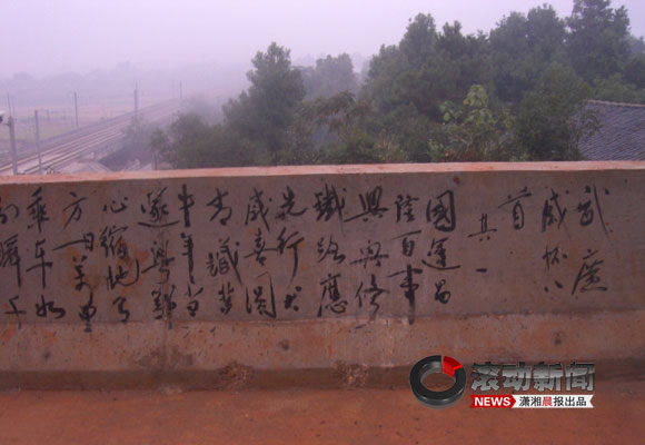 “太有才了!如此流暢的書法作品,的確為鐵路建設(shè)增色不少!本W(wǎng)友“龍?zhí)t”在紅網(wǎng)論壇發(fā)《水泥墻上見功底武廣橋上一奇葩》,帖中曝料他在武廣高速鐵路客運專線上的一跨線橋的擋墻上,拍到建橋人如行云流水一般的書法作品。據(jù)當(dāng)?shù)刂槿苏f,這些書法作品是其中一位承建包工頭建完橋后有感而書的。