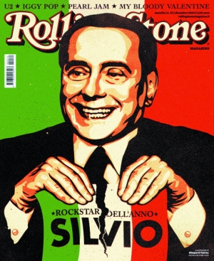 在這期《滾石》雜志(12月號)封面上赫然印著藝術化了的貝盧斯科尼微笑肖像,其背后是意大利國旗,手中則拿著撕裂的意大利國旗!稘L石》雜志意大利版編輯卡洛·安東內利(Carlo Antonelli)稱,這位73歲的媒體大亨是由雜志編輯們一致推選成為“年度搖滾之星”的,他說:“今年大家的意見都很一致,他有明顯的優(yōu)勢,他的生活用‘搖滾’二字來形容都不夠!