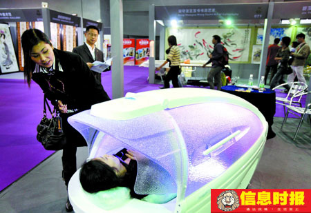 “這是家庭用的水療美體太空艙,過(guò)去只在國(guó)外流行,現(xiàn)在是在中國(guó)很流行。”來(lái)自北京某醫(yī)療器械公司負(fù)責(zé)人沈麗娟說(shuō),中國(guó)人很講求私密性,到美容院做美體水療不如在家來(lái)得舒坦。這臺(tái)家用式水療美體太空艙集沐浴、水療、按摩、干溫蒸等功能于一體,內(nèi)部還設(shè)紅外線治療、LED藍(lán)光治療等,而且可以一邊做美體一邊聽(tīng)音樂(lè)、睇電視。
