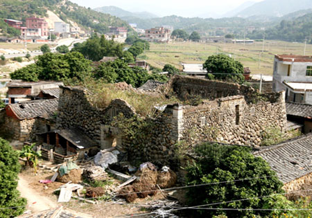 石堡是一個(gè)長(zhǎng)方形建筑,長(zhǎng)37米、寬31米,墻體內(nèi)外全是用鵝卵石及條石砌成,歷經(jīng)數(shù)百年風(fēng)雨,雖說已經(jīng)沒有了屋頂,只留下高約8米的墻基,但依然雄偉屹立。石堡的三面是護(hù)厝房,外墻也是石頭,但內(nèi)墻是由土夯成的,非常牢固,石堡大門上陰刻“懷珠”兩字。