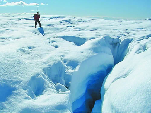 隨著氣候變暖,許多冰蓋開始融化,冰融水形成了一條條溪流。這些溪流最終又會(huì)流入冰川鍋穴之中。冰川鍋穴就是冰川中近于直立的井穴或洞穴,是由冰面因融化等原因坍落而形成。人們站在這樣的冰面上,可以聽到巨大的水流聲,可以明顯感受到危險(xiǎn)的存在。如果落入冰川鍋穴之中,你將會(huì)永遠(yuǎn)被埋于冰層之下。冰融水流入冰川鍋穴后還會(huì)起到一種潤(rùn)滑作用,促使冰川向大海加速移動(dòng),最終整個(gè)冰川消失于海水之中。