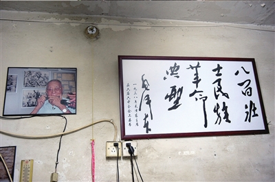 王家將靈堂設在老人臥室之中,不大的臥室里擺放著網友送來的花圈,挽聯上寫著“沉痛悼念抗日英雄王文川先生”。老人的遺像安放在靈堂正中,遺像中的老人戴著眼鏡神態(tài)安詳,遺像前擺放著老人生前佩戴的手表和一把上海牌口琴。