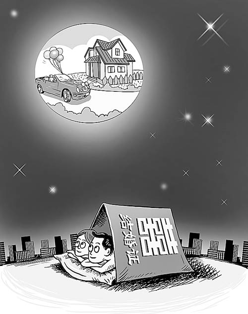 不買房,不買車,不辦婚禮,不買婚戒……除了花九塊錢去登記處辦理紅艷艷的結(jié)婚證,其他都可以不要。近來(lái),網(wǎng)絡(luò)上的一篇題為“一個(gè)裸婚者的自白”的帖子,引發(fā)網(wǎng)友關(guān)注。“裸婚”,這個(gè)在2008年全球金融危機(jī)下誕生的新詞兒,在2009年不斷上揚(yáng)的房?jī)r(jià)“助推”下迅速流行。新浪網(wǎng)網(wǎng)友“同道”稱,“‘裸婚’是高房?jī)r(jià)賜給白領(lǐng)的‘新時(shí)尚’!