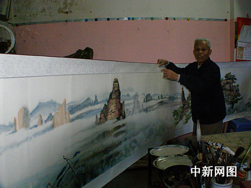 中新網(wǎng)韶關(guān)12月29日電 (馮昶 袁少洪)年近八旬的中國畫家譚飛彬老先生為支持丹霞申遺而創(chuàng)作的三十米國畫《丹霞山》,今日完成。
