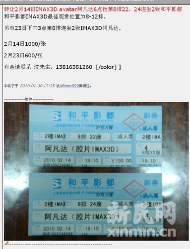 2月14日阿凡達(dá)IMAX票已炒至1000元!和平影都2月影票自1月29日開售起,便掀起新一輪購票狂潮。新民網(wǎng)記者近日在各大論壇及購物網(wǎng)站上看到,2月份影票大多已飆至500元,2月14日晚6點(diǎn)場次已炒至1000元。對此,和平影都總經(jīng)理王伯政表示:“‘黃!坏昧,這也不是我能管的!