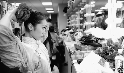 序幕里,周巖扮演的“和諧少女”在舞臺上空飛過,造型驚艷,一下子就調(diào)動(dòng)起了觀眾的情緒。但在第一次吊威亞培訓(xùn)時(shí),她哭了!盀榱税踩弦档锰貏e緊。”在天上吊著的時(shí)候沒有什么感覺,結(jié)果腳一著地,“就疼哭了”。