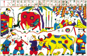 這里重點要說的是立春日的迎春。立春在陽歷的二月四日或五日,不同的年份,該日或在春節(jié)之前,或在春節(jié)之后,但其迎春活動,同春節(jié)的喜慶是聯(lián)為一體的。迎春活動的主體是鞭春牛,舊時用以表達勸農(nóng)和春耕的開始。宋孟元老《東京夢華錄》云:“立春前,開封府進春牛入禁中鞭春。開封、祥符兩縣,置春牛于府前,至日絕早,府僚打春,如方州儀。”而《正德瓊臺志》對于此俗的記載更為詳細:“迎春日,府衛(wèi)官盛服至于東郊迎春館,武弁各競辦雜劇故事,會聚逞炫。俟祭勾芒神畢,前導,城市內(nèi)外老稚集于通衢,各攜婦幼,男女競看士牛自河口街從西門(或南門)入府,將豆谷灑之,謂消壓痘疹。是日以面餅裹生菜諸肉品啖之,曰春餅!薄兜拦猸傊莞尽匪浳淖致杂胁煌纭坝喝铡弊鳌傲⒋呵耙蝗铡保案l(wèi)官”作“府縣官”,“武弁”作“街坊”,吃春餅作“親鄰以春餅相饋遺”,但大體程序是相同的。蘇軾貶瓊時,有《減字木蘭花·海南春詞》記此盛況,氣氛異常濃郁:“春牛春杖,無限春風來海上。便丐春工,染得桃紅勝肉紅。春幡春勝,一陣春風吹酒醒。不似天涯,卷起楊花似雪花!笨芍毫曀讖谋敝聊,從宋到元至明清乃一脈相承。