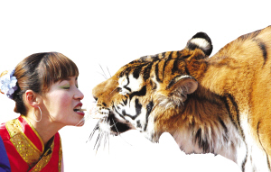 晁改敏被蘇州人熟悉,是在去年11月。那時(shí),她所在的馬戲團(tuán)與蘇州白象灣景區(qū)正式簽約,她和丈夫也告別了各地流動(dòng)演出的生活,帶著英雄虎爸虎媽和它們的兩只虎寶寶,在蘇州暫時(shí)定居。白象灣景區(qū)開(kāi)園的時(shí)候,晁改敏表演了叼肉喂虎節(jié)目,此前她曾因此節(jié)目,被譽(yù)為中國(guó)第一馴虎女郎。當(dāng)她叼著肉,老虎從她的嘴邊把肉吞下時(shí),她的口與虎口近乎零距離。此后,游人多的時(shí)候,晁改敏總會(huì)表演這一節(jié)目,晁改敏也因此在蘇州名氣響亮。