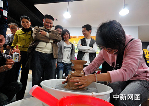 制作現(xiàn)場上,優(yōu)美動聽的古箏樂曲不停地繚繞盈耳,瓷藝家們或捏或雕,或刻或鏤,或推或接,各種傳統(tǒng)技法紛紛上陣,精彩紛呈。這行云流水般的手法、精妙細(xì)致的做工、別出心裁的設(shè)計(jì),讓參觀者看得眼花繚亂,贊嘆不已,為之折服。人們?nèi)滩蛔∩锨懊幻?xì)膩的瓷泥,轉(zhuǎn)一轉(zhuǎn)工作盤,拿一拿精致的制作工具。前來參觀的顏小姐不禁挽起袖子也親身體驗(yàn)了一回手拉坯。在轉(zhuǎn)盤的帶動下,顏小姐雙手輕拉瓷泥,那團(tuán)柔軟的瓷泥仿佛有了靈性一般“舞蹈”起來,一會變成一個(gè)款嘴的大海碗,一會又變成一個(gè)細(xì)腰的小花瓶。舉著滿手的瓷泥,顏小姐開心地說:“太有意思了,讓我想起小時(shí)候玩泥巴的情景!彼表示:“下次有空的時(shí)候,我一定還要再來玩手拉坯,DIY一件作品做紀(jì)念!