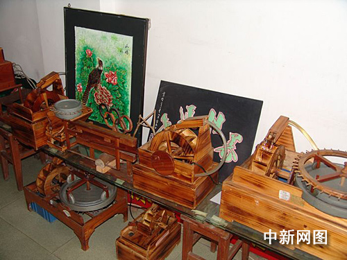 涂祖奕介紹,這些“活寶”名為“水驅(qū)仿古飾物”,是他經(jīng)多年時間,在繼承中國傳統(tǒng)農(nóng)業(yè)水利設施精華的基礎上,匠心獨運,按照一定的比例微縮精做而成,有微型水碓、水磨、輪碾、水鋸等5個系列40多個品種,均已獲國家專利證書。