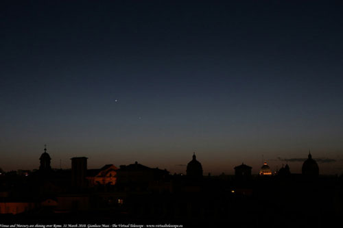 據(jù)美國太空網(wǎng)報(bào)道,近日,一名意大利天文學(xué)家拍攝到罕見的天象照片:水星和金星同時(shí)在羅馬的夜空閃耀。