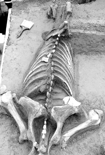 4月 12 日上午,高青陳莊遺址發(fā)掘?qū)<已杏憰?huì)在省博物館舉行,來(lái)自中國(guó)社科院、北京大學(xué)等單位的多位考古專(zhuān)家,對(duì)幾個(gè)月來(lái)的考古成果進(jìn)行了論證。考古人員發(fā)現(xiàn)馬匹均呈“直立跪伏”狀,非常罕見(jiàn)。