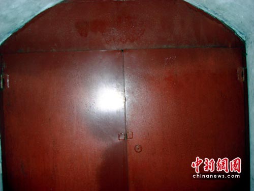 日前,記者聽說少林寺在建造一座地宮,便前往一探究竟。這座傳說的人造地宮,位于塔林西側(cè)約50米處,門口由青石砌成。地宮的石門不大,高約1米,寬約0.8米,被一把銅鎖鎖住。通過石門約5公分的門縫往里看,只能看到里面漆黑一片。當(dāng)記者用卡片相機(jī)伸進(jìn)石門門縫拍攝時(shí),里面又是一扇紅色的鐵門,右側(cè)的墻壁上還安裝有電源開關(guān)。