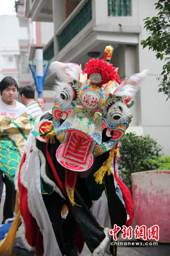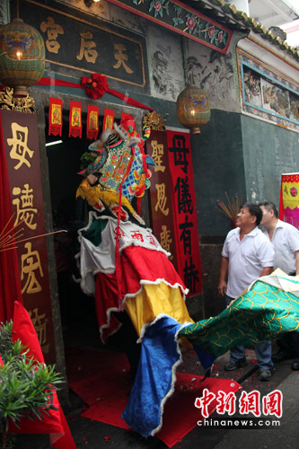 上午9點半,沙欄嚇村的吳氏宗祠前,吳姓老人們在祠堂內(nèi)向祖宗敬香。麒麟舞依然是主要的慶;顒印kS后,由兩頭矯健的麒麟帶隊,40多位吳氏村民組成的麒麟隊,連同他們吸引的大批村民和觀光客一同浩浩蕩蕩地繞村一周,為全村祈福迎祥。半個多小時后,游行隊伍在敲鑼打鼓和鞭炮齊鳴聲中抵達祭祀媽祖的天后宮。