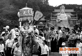 下午1時40分許,從臺灣專程趕來的500信眾,手捧數(shù)十尊天后像隆重入場祭拜。他們穿著傳統(tǒng)服裝,攜帶各種旗幟及獅陣、太子陣、將爺陣等隊形進入天后宮。據(jù)說,昨天午后1時40分是拜祭媽祖的吉時。據(jù)悉,今后臺灣信眾有望繼續(xù)前往南沙天后宮參加媽祖誕。