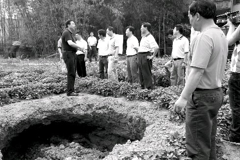 宜賓市長寧縣硐底鎮(zhèn)近日陸續(xù)出現(xiàn)“天坑”,最大的“天坑”直徑4日已經(jīng)擴(kuò)大到60米,112戶群眾暫時(shí)轉(zhuǎn)移(本報(bào)昨日?qǐng)?bào)道)。昨日,宜賓市委常委、常務(wù)副市長徐進(jìn)率宜賓市國土、安監(jiān)、交通等部門前往硐底鎮(zhèn)進(jìn)行現(xiàn)場(chǎng)查看。據(jù)了解,4日下午,紅旗村再出現(xiàn)一個(gè)“天坑”,“天坑”數(shù)量目前增至27個(gè)。