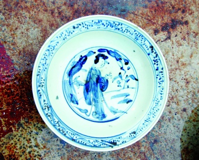 目前見(jiàn)到的文物種類(lèi)主要是青花瓷大盤(pán),此外也有青花瓷缽、青花小酒杯、青花碗、貼塑龍紋罐、銅板、鐵器及金屬凝結(jié)物等等。崔勇介紹,其中青花瓷大盤(pán)和帶蓋青花瓷缽是有代表性的器物,瓷胎和釉質(zhì)比較厚重,青花顏色不太鮮亮,發(fā)灰或者發(fā)黑,無(wú)論人物還是花草圖案都比較隨意,器表施滿釉,底足粘有細(xì)砂,即“砂足器”,屬于外銷(xiāo)瓷中的常見(jiàn)類(lèi)型。