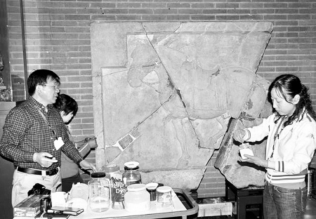 在完成了一系列的前期試驗(yàn)準(zhǔn)備工作之后,當(dāng)?shù)貢r(shí)間5月18日,西安赴美的文物修復(fù)專(zhuān)家與美方專(zhuān)家一道開(kāi)始對(duì)“二駿”本體實(shí)施修復(fù),工作由實(shí)驗(yàn)室研究轉(zhuǎn)至為文物實(shí)體的補(bǔ)全。
