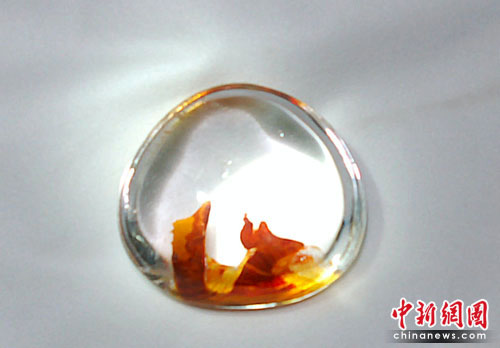 全國(guó)30多個(gè)單位的參展商帶來的珍品將整個(gè)展館擺放的滿滿當(dāng)當(dāng)。當(dāng)記者來到水晶展柜前時(shí),來自西安的張老板拿出了自己收藏了十多年的天然水晶“王者之鳳”。據(jù)他介紹,天然水晶是水受到擠壓后形成冰膜,吸取地下的氧化亞鐵和鎂元素后形成的!巴跽咧P”原產(chǎn)地為巴西,圖為一只頭戴王冠的鳳凰昂首挺胸站在山頂上,鳳尾向下飄垂,紅黃兩色代表著吉祥喜慶,極其罕見。