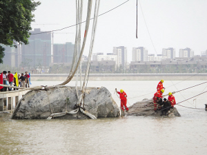 4股共8根白色的“繩子”從空中吊臂上垂下,已經(jīng)將一塊露出水面最多的不規(guī)則疑似巨石牢牢“網(wǎng)”住。“勇士”號(hào)打撈船現(xiàn)場(chǎng)總指揮王雷告訴記者,打撈船自身重達(dá)萬噸,這8根白色“繩子”應(yīng)該叫“高強(qiáng)度尼龍纜繩”,每根比一個(gè)成人的手臂都粗出許多,是由特殊材料定制的,造價(jià)不菲!坝率俊碧(hào)上月28日進(jìn)入打撈水域后,就開始馬不停蹄地為打撈做前期準(zhǔn)備,近50名專業(yè)打撈人員,輪換潛水進(jìn)入江底巨石所在位置,進(jìn)一步清淤后又用高壓設(shè)備沖泥,這樣將巨石臥江位置沖出一定空間。再將高強(qiáng)度尼龍纜繩穿過石體,到昨天才剛剛固定完畢。記者問他,這些專業(yè)人士潛入江底,能否看到石塊上有字跡或其他古跡。王雷說,“潛下去后,水下的能見度為零”,同時(shí),因?yàn)閷I(yè)人士全身著特定的潛水打撈衣,手也無法感知。所有一切疑問及待解之謎,看來只有留待巨石出水之時(shí)解開了。