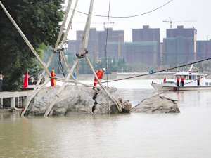 鎮(zhèn)江文廣新局副局長孫小梅表示,在打撈預(yù)案中已有巨石破裂的預(yù)案,并且打撈方認為這種可能性超過50%,因為巨石是從焦山頂上摔落至江中的石體早已受損;加上多年的風(fēng)化、江水長期浸泡,使得石體出現(xiàn)質(zhì)變。打撈只不過將巨石的隱性傷痕變?yōu)轱@性。
