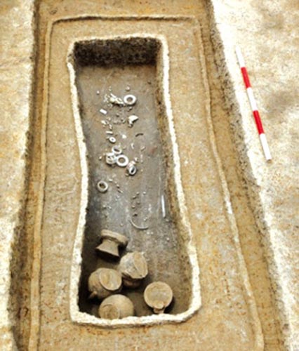 據(jù)介紹,今年3月初,浙江省文物考古研究所和余杭博物館聯(lián)合對玉架山遺址繼續(xù)進行發(fā)掘、探索。本年度發(fā)掘至今,清理良渚文化墓葬32座(共200座);可能存在房址的東北角附近已著手發(fā)掘。依照計劃尋找遺址對外通道,解剖了環(huán)壕東北角向北延伸的部分(鉆探時推測為北通道),獲知解剖點的北通道寬約9.5米,深1.5米。在距北通道西側(cè)約30米處發(fā)現(xiàn)了另一小遺址,清理了一條東西向小溝(局部),在小溝的北岸壘有一些石塊,并發(fā)現(xiàn)了良渚文化晚期小墓墓地,暫時清理了其中一座。