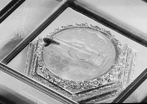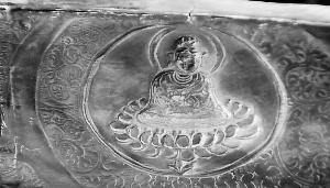 圣物供奉在全國工藝大師王殿祥親手設計制作的楠木刻金寶座上。這兩套楠木刻金寶座直徑有15厘米,高度為12.5厘米,寶座底座和下三層都是浮雕,圖案主要是一些蓮花等佛教紋飾,上面三層是蓮花花瓣。最上面一層采用圓雕手法“綻放”出朵朵蓮花。兩個寶座采用楠木雕刻,貼附金箔,寶座金光熠熠,莊重而華貴。