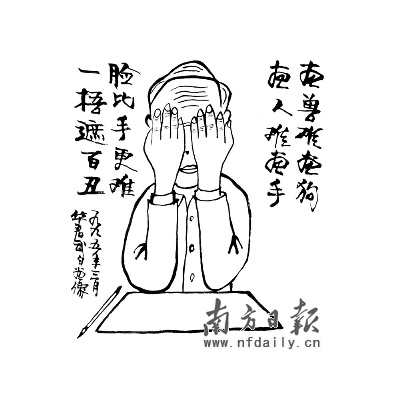 廖冰兄有一幅著名的漫畫《自嘲》,辛辣刻畫了一些人在“甕破”之后仍然瑟瑟發(fā)抖的形象。華君武也有一幅《自畫像》,但畫中人卻沒有露出面孔,華君武這樣風趣地自嘲說:“我是畫不了素描的嘛,當然也就畫不了自畫像。怎么辦?只好畫了一個人,雙手緊緊地把臉捂住!