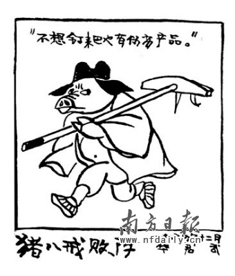 “文革”結束后,華君武出任全國美協(xié)副主席。這個時期華君武特別喜歡畫豬八戒。他認為人性中的弱點,豬八戒幾乎大都具備。上世紀80年代假冒偽劣產品出現(xiàn),他揮筆創(chuàng)作《豬八戒敗陣》,畫中的八戒之所以敗陣,就因沒想到連他用的釘耙也是假冒偽劣產品,因而打了敗仗。因為這一系列諷刺作品,有人形容華君武的漫畫是“刀刀見血,入木三分”。