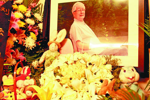 擺放在靈堂上的相片是華老的小兒子華方方在2005年春末拍攝的,就在自家樓下小花壇,一小枝綠色枝條,老人安詳?shù)男δ,氣韻生?dòng),華老生前看過(guò)非常滿意。華老屬兔,他和兔子感情特別深,晚年更成了老小孩,睡床四周是大大小小的卡通兔、絨毛兔,他當(dāng)兔子王,F(xiàn)在這些兔子朋友環(huán)繞著他的遺像,華老一點(diǎn)都不寂寞,有兩只他最心愛(ài)的玩具兔還將陪他在墓地到老。