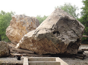 或許是巨石過于沉重,巨石下墊放的粗壯枕木有的都被壓斷,平臺面上還被砸出大小不等的坑,可見巨石落地時(shí)的巨大壓力。四塊巨石相鄰而放,在最小的一塊石頭上,還留有一根纜繩,足有成人手臂粗。焦山碑林碑刻博物館館長丁超告訴記者,四塊巨石的出水時(shí)間分別在10日、15日和19日三天。盡管4日打撈一塊巨石出水時(shí)出現(xiàn)碎裂,但經(jīng)專家們分析后,還是決定按照原計(jì)劃打撈,即通過潛水江底沖淤后給巨石穿高強(qiáng)度尼龍纜繩起吊。