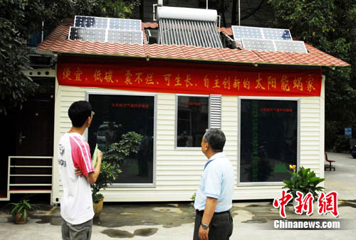 記者看到,這間鋼架結(jié)構(gòu)的房屋功能齊備,雖只有10余平米,但衛(wèi)生間、沐浴間、客廳、臥室一應(yīng)俱全。該房子的主人、退休工程師朱培世告訴記者,房子是由他和團(tuán)隊(duì)成員花了10個(gè)月左右的時(shí)間完成,屋頂上裝有4大塊太陽(yáng)能板,屋內(nèi)的熱水、通風(fēng)、照明、供暖、甚至降溫都由這幾塊太陽(yáng)能板提供的能量完成,是一座名副其實(shí)的太能房屋。其方倉(cāng)建筑、儲(chǔ)冷降溫、太陽(yáng)供暖、多功能窗、電池支架還獲得國(guó)家專(zhuān)利。