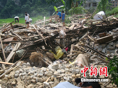 中新網(wǎng)河池8月4日電 (羅開革 王剛)廣西河池市鳳山縣公安局4日上午透露,該縣3日發(fā)生大面積山體滑坡事故,上萬(wàn)立方的泥土和石頭摧毀了5間民房。所幸房?jī)?nèi)人員及時(shí)逃生,沒(méi)有造成人員傷亡。
