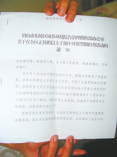 昨日上午,(四川)眉山市東坡區(qū)禁煙行動(dòng)辦公室(簡(jiǎn)稱“治理辦”)工作人員正在起草一份關(guān)于禁煙的文件。文件的題目是《眉山市東坡區(qū)城鄉(xiāng)環(huán)境綜合治理指揮部辦公室關(guān)于在全區(qū)正科職以上干部中開展禁煙自查活動(dòng)的通知》,包括幾百字的文字和一份禁煙自查表。