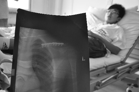 安頓好兒子后,房女士和丈夫就悄悄離開了學(xué)校。“你們孩子傷著了,你快到醫(yī)院吧!”不到10點(diǎn),學(xué)校的一個(gè)電話把房女士嚇壞了。兩口子趕緊趕到濟(jì)南一零六醫(yī)院,兒子小吳正躺在病床上,頭部左半邊有瘀傷,左肩鎖骨骨折,需要馬上手術(shù)。