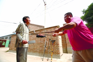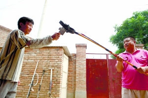 吸刀器、鎖喉器、捕捉器、自救器,昨日,北京八中的萬能工(什么活都能干的工人)齊海軍在通州古城村的自家門前,演示起他發(fā)明的校園安!八募住。