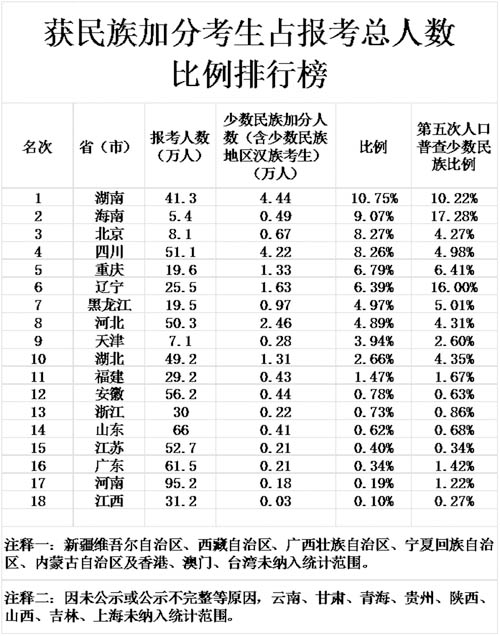除此之外還有北京。北京今年獲加分的人數(shù)近1.1萬人,占全部考生8.1萬人的1/8強(qiáng)。即使減去少數(shù)民族考生6700余人,仍有4000余人獲得加分。